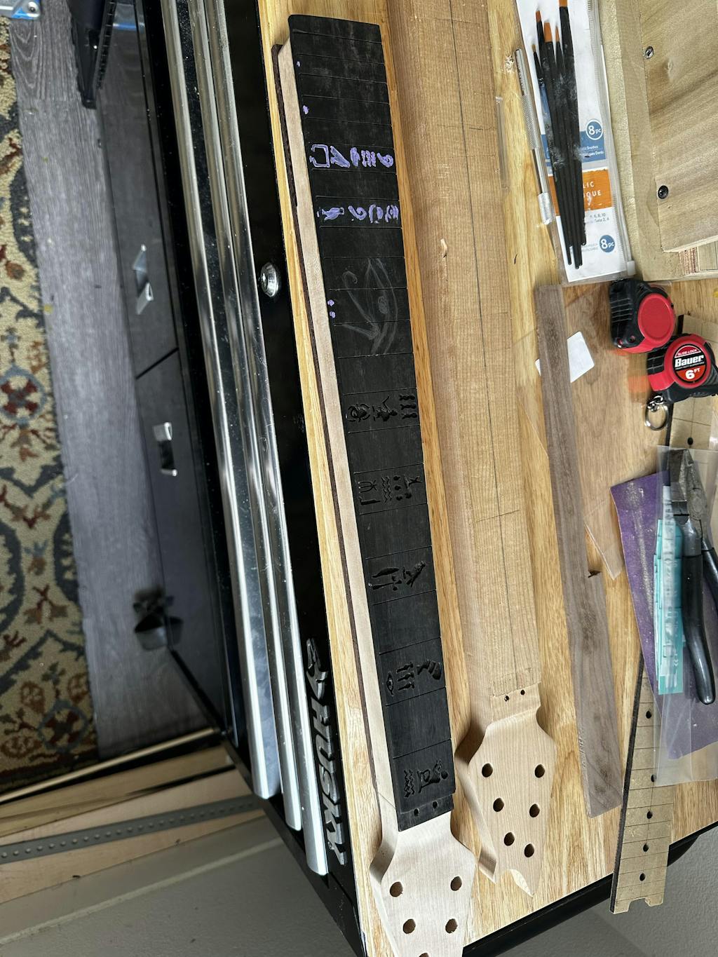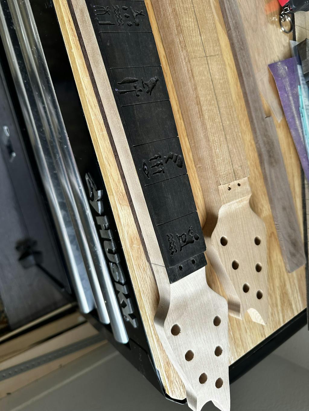 This precision router base holds a Dremel and it helps you free your hand for inlaying, widening fret slots, and other routing jobs. The cutting depth is adjustable by the brass thumbwheels. There's a nozzle for attaching an air pump to blow away the dust. Made of aluminum, brass and stainless steel.